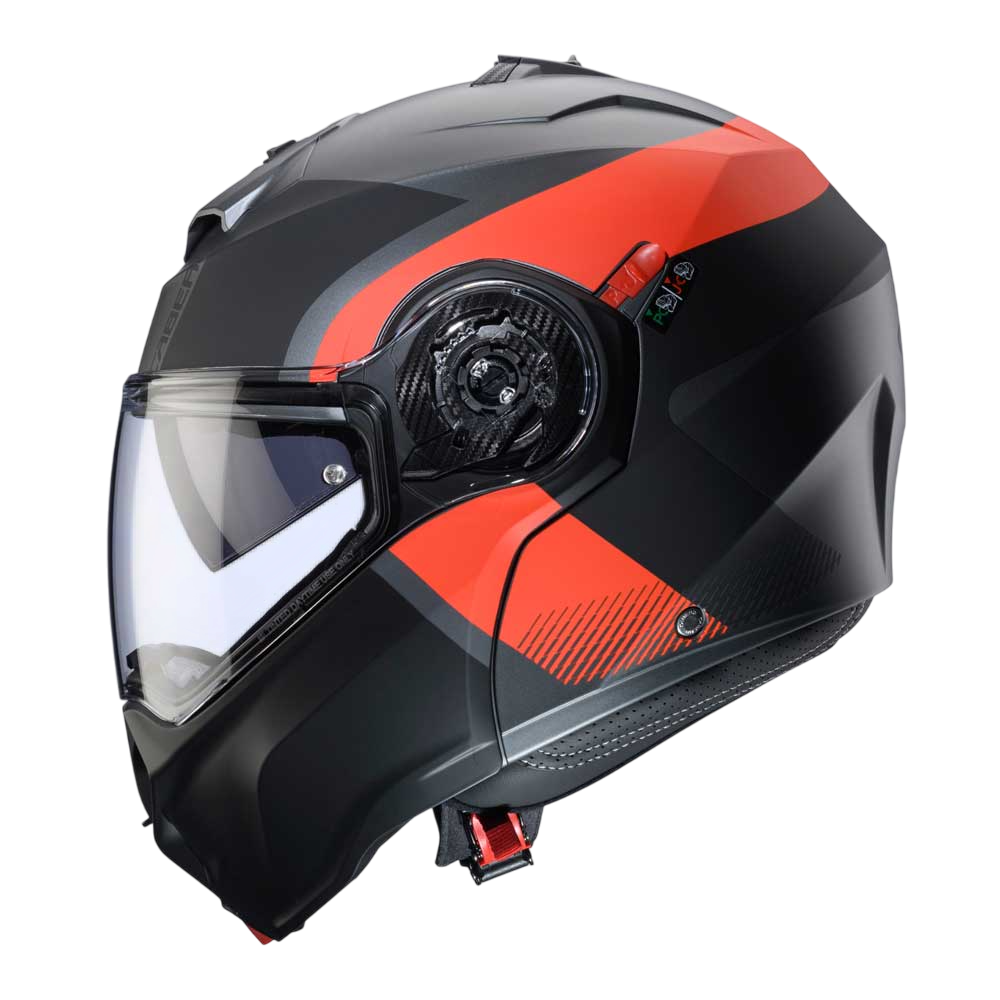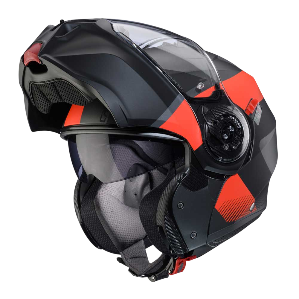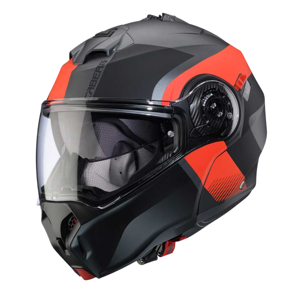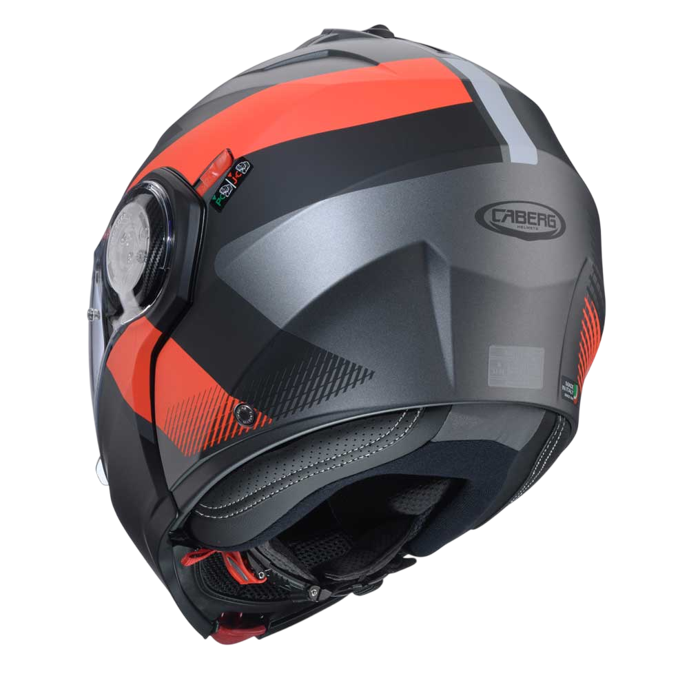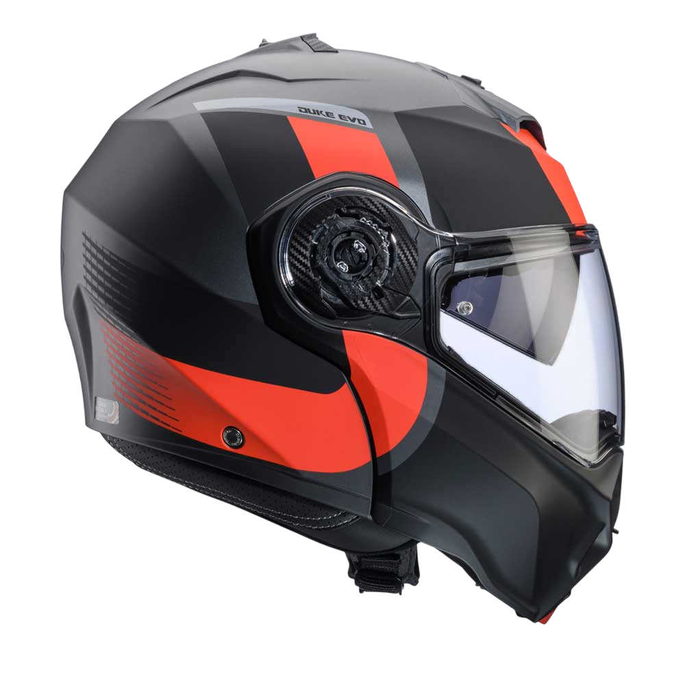 DUKE EVO is the evolution of Caberg’s DUKE helmet, ECE 22.06 approved, with breathable fabrics and new mechanisms for chin guard and visor opening. Equipped with Double Visor Tech and compatible with the PRO SPEAK EVO, it comes in various colours and graphic versions.