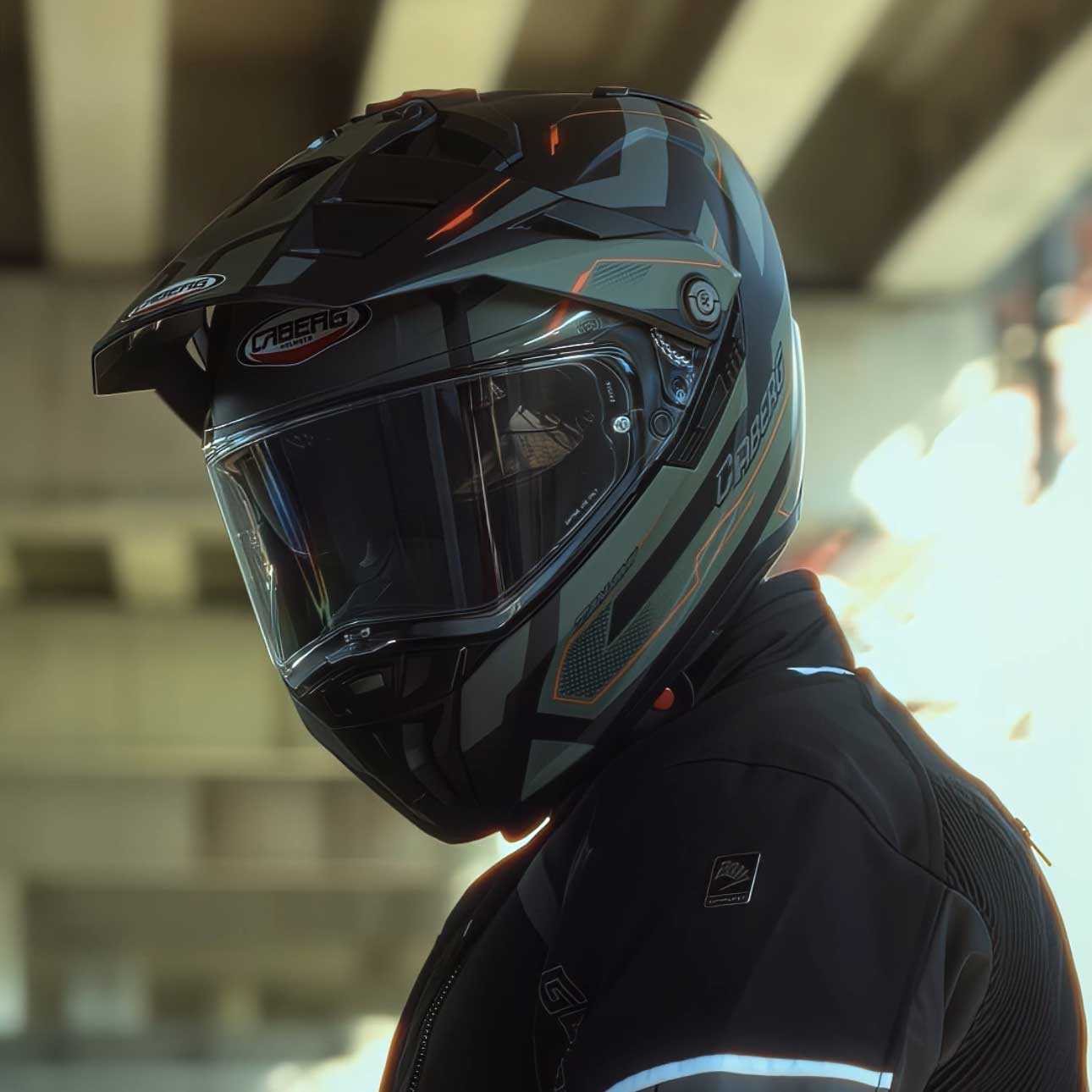 Tanami Ranger Matt Black, Military Green & Orange Full Face Motorbike Helmet