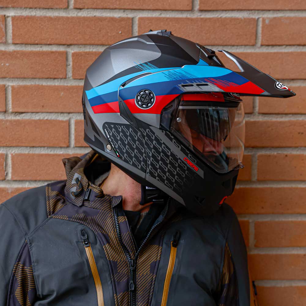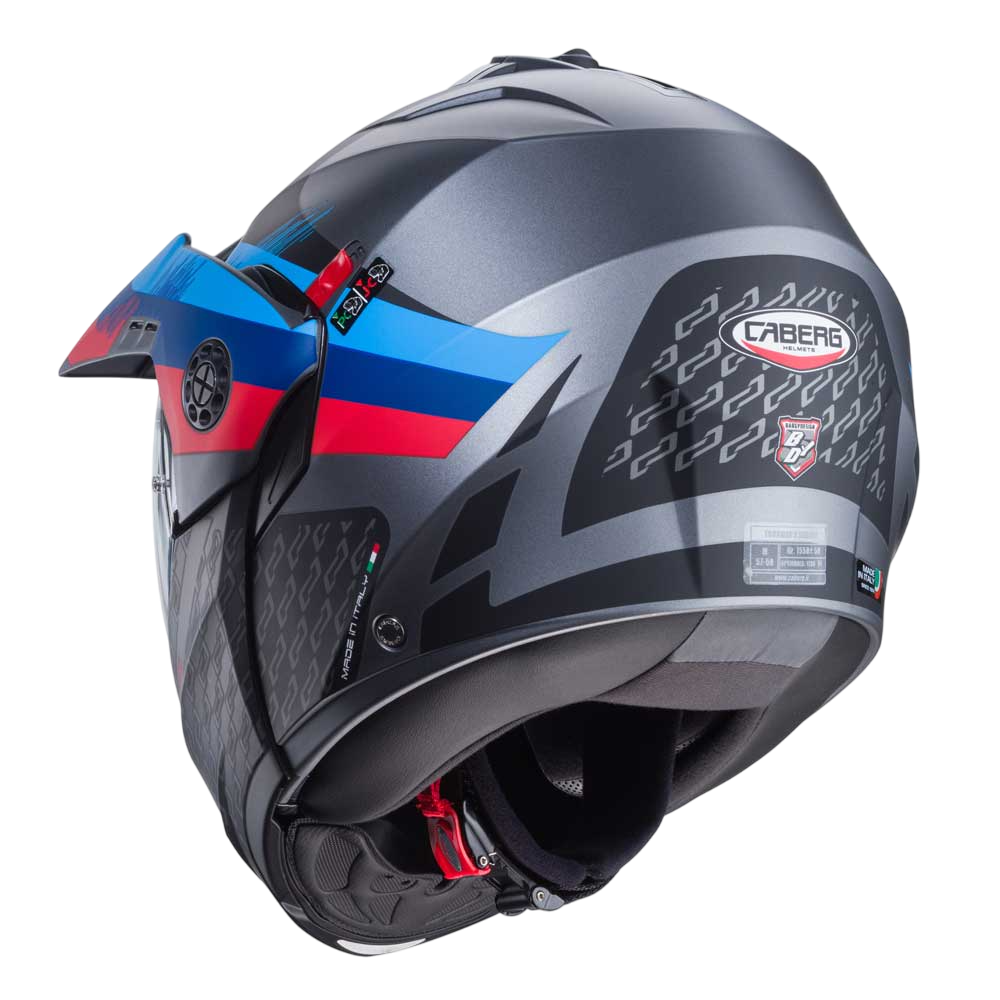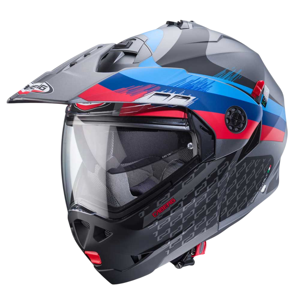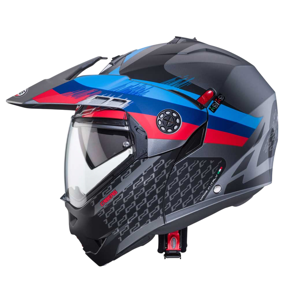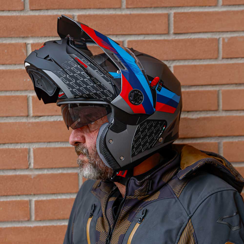 The TOURMAX X is the first flip-up Adventure helmet for Enduro and Maxi Enduro, with dual P/J homologation. Equipped with the Double Visor Tech system, Pinlock visor, and compatible with the PRO SPEAK EVO communicator, it ensures safety and comfort in all conditions.